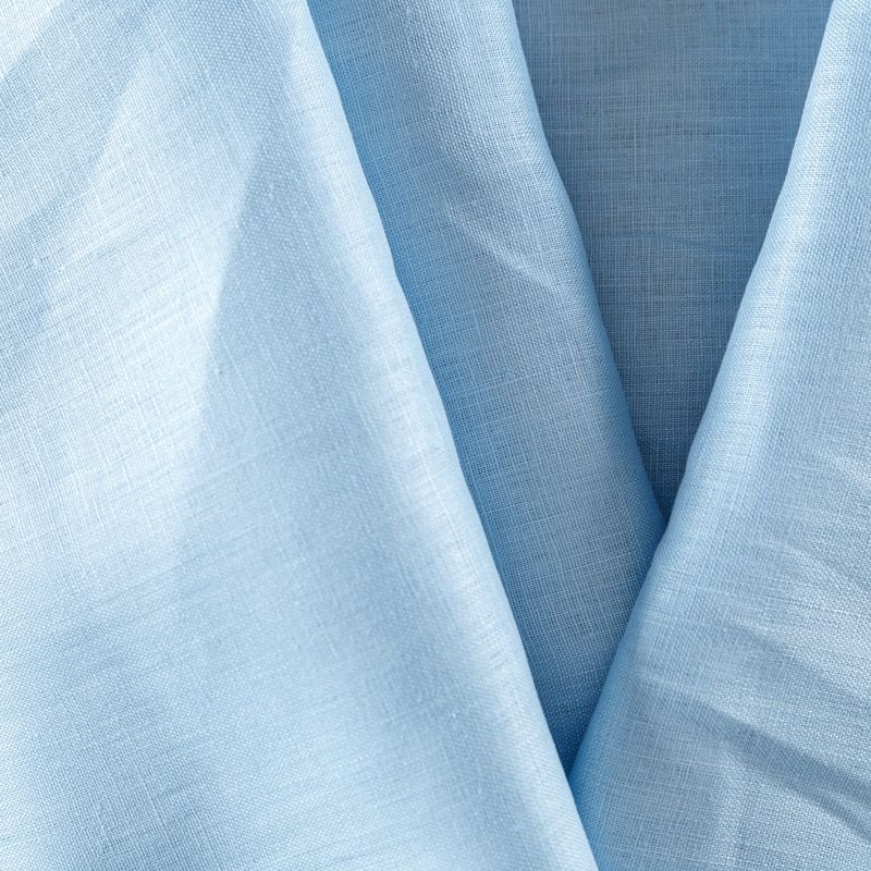 Итальянский костюмно-плательный лен голубого оттенка. Ткань прочная, имееет на ощупь приятную, гладкую поверхность, а визуально - выраженный рельеф и полотняное переплетение, держит форму, пластичная. Подойдет для пошива костюмов, брюк, шорт, юбок, платьев, рубашек, сарафанов, топов, комбинезонов, жакетов, кардиганов.