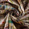 Плательно-рубашечный лен цвета хаки с абстрактным многоцетным принтом. Ткань легкая, средней плотности, поверхность матовая. Приятная на ощупь, хорошо держит форму, немного тянется. Отличный вариант для летних платьев, сарафанов, рубашек, брюк или шорт.