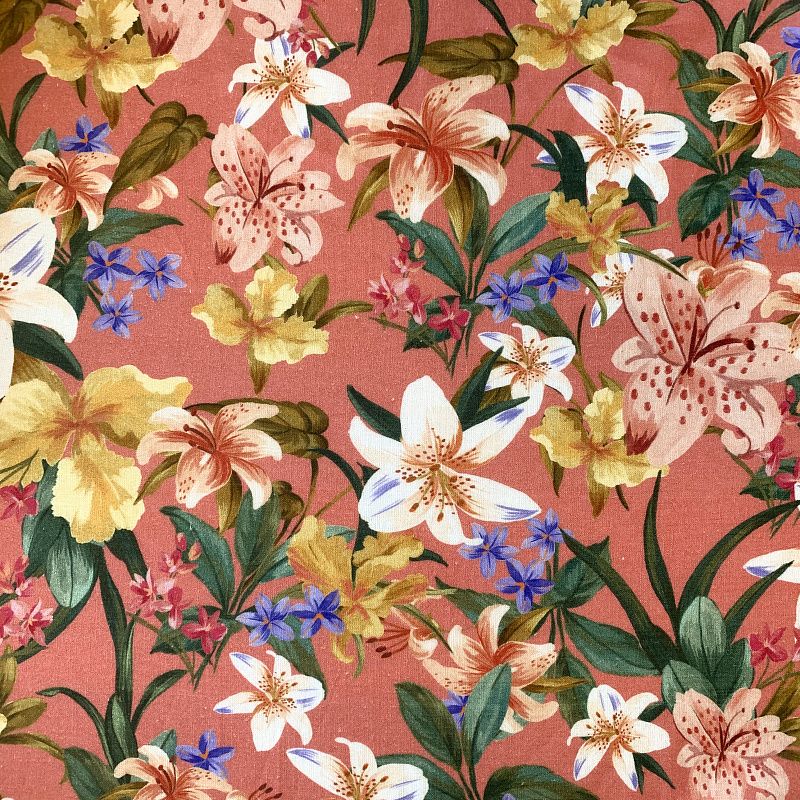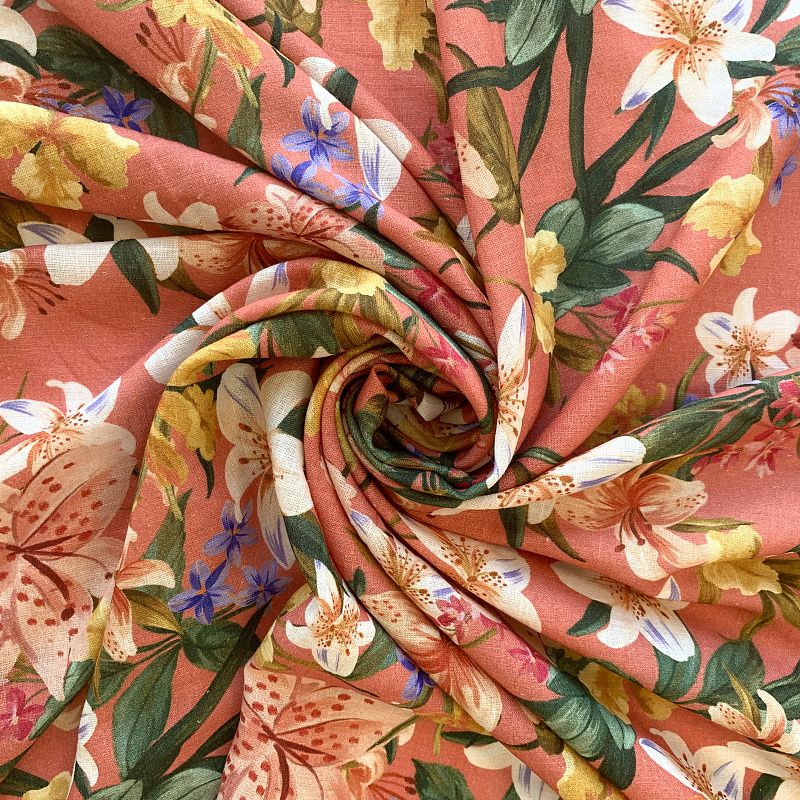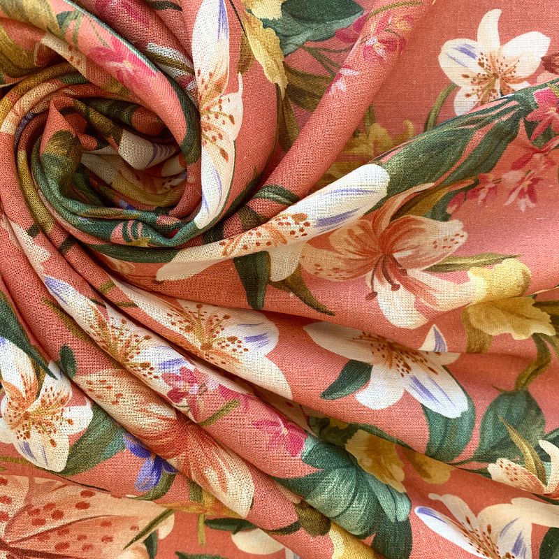 Прочный, выразительная матовая рельефная поверхность, полотняное переплетение, хорошо держит форму, мягкий на ощупь, пластичный, отлично драпируется, тянется. Прекрасно подойдет для пошива летних платьев, сарафанов, юбок, рубашек, брюк и шорт. Льняная плательная ткань с изображением  соцветий ярких лилий на благородном коралловом фоне.