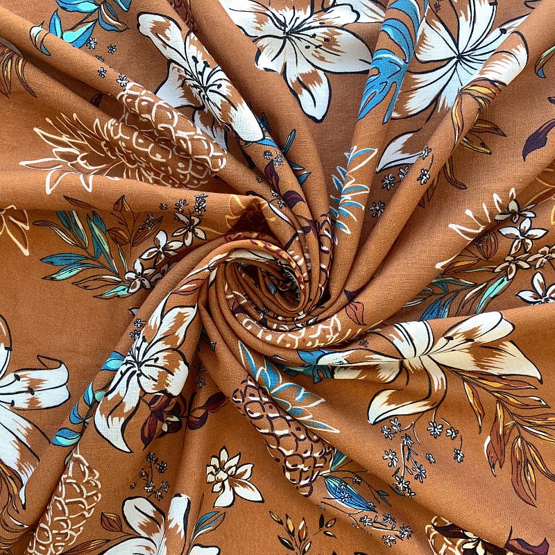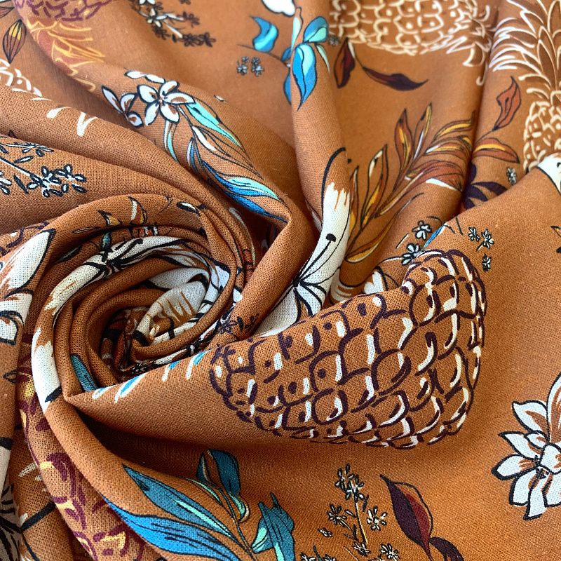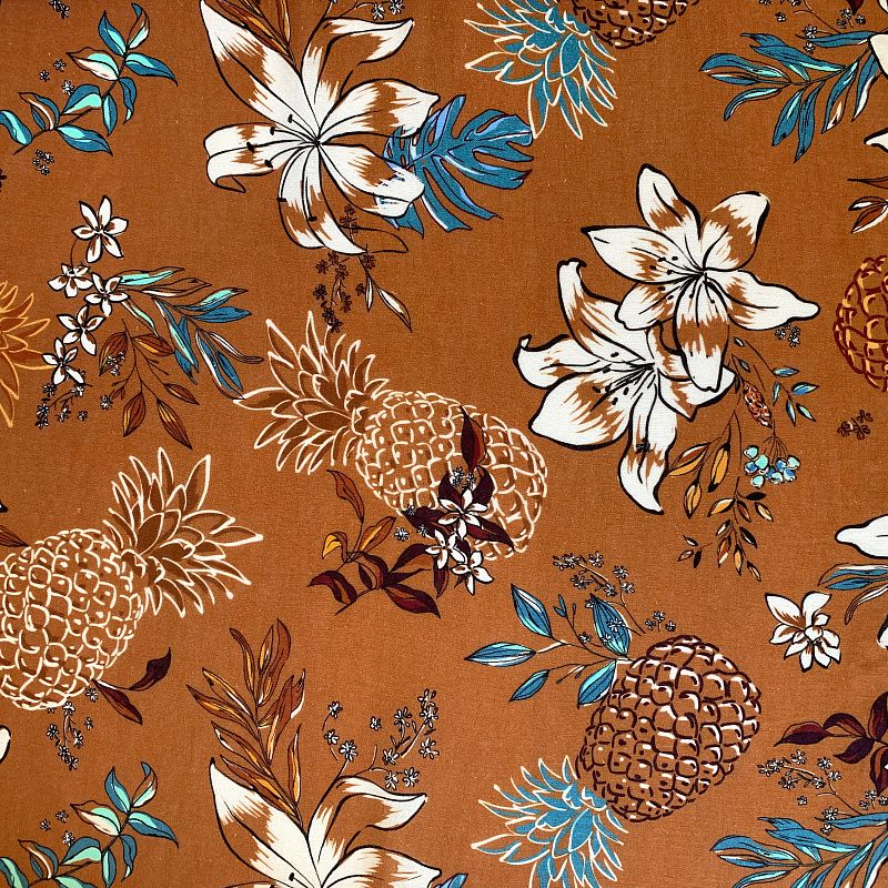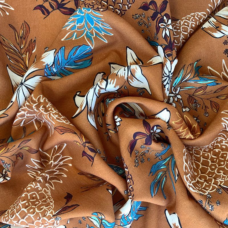 Прочный, выразительная матовая рельефная поверхность, полотняное переплетение, хорошо держит форму, мягкий на ощупь, пластичный, отлично драпируется, тянется. Прекрасно подойдет для пошива летних платьев, сарафанов, юбок, рубашек, брюк и шорт. Льняная плательная ткань с изображением  тропических растений и фруктов  молочно-голубого цвета на выразительном золотисто-коричневом фоне.