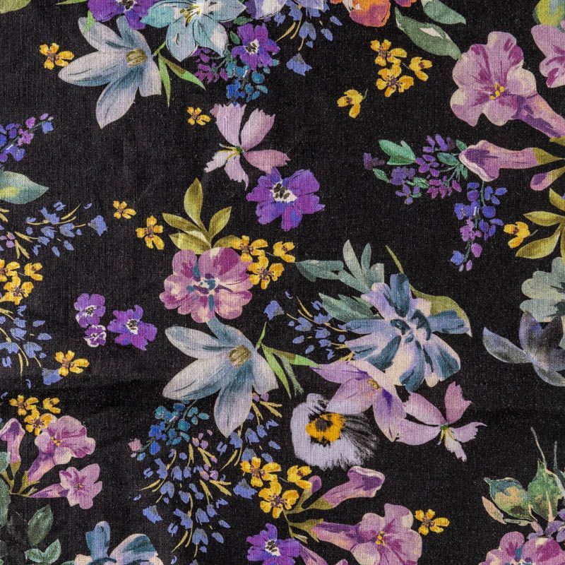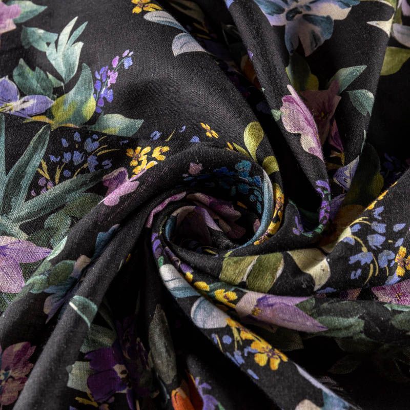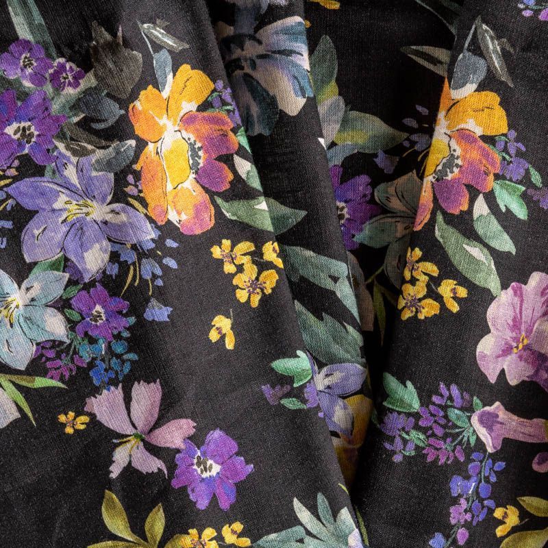 Прочный, выразительная матовая рельефная поверхность, полотняное переплетение, хорошо держит форму, мягкий на ощупь, пластичный, отлично драпируется. Прекрасно подойдет для пошива летних платьев, сарафанов, юбок, рубашек, брюк и шорт. Льняная плательная ткань с ярким цветочным принтом на строгом черном фоне.