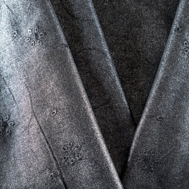 Оригинальный натуральный лен декорирован серебристым напылением и элегантной вышивкой по всему полотну. Ткань хорошо держит форму, не жесткая, отлично драпируется, тянется за счет эластана в составе. Прекрасно подойдет для пошива летних платьев, костюмов, жакета, сарафанов, туники, юбки, рубашки, брюк и шорт.