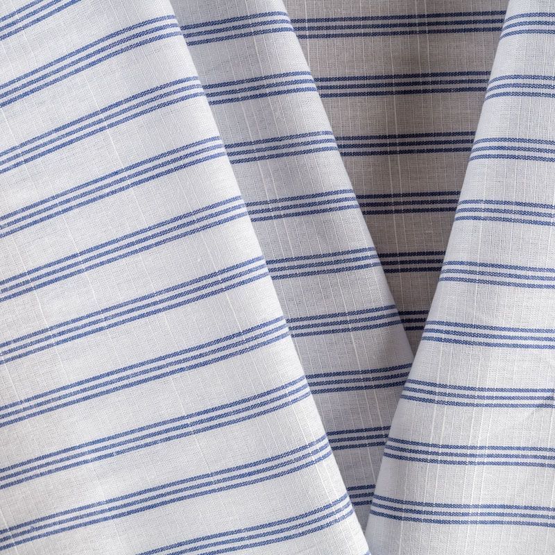 Ткань лёгкая, непрозрачная, поверхность матовая имеет льняную текстуру, приятная к телу, хорошо драпируется. По назначению - для юбки, платья-рубашки, сарафана, туники. На белом фоне тройная тонкая полоска темно-синего цвета расположена вдоль кромки.