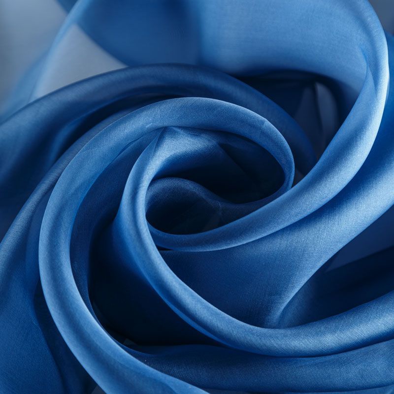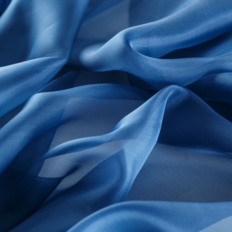 Шелковая невесомая органза с искрящейся поверхностью синего оттенка. Ткань легкая, тонкая, пластичная, хорошо драпируется, просвечивает, отлично держит форму. Подойдет на блузку, платье, тунику или юбку на подкладе.