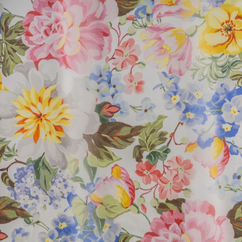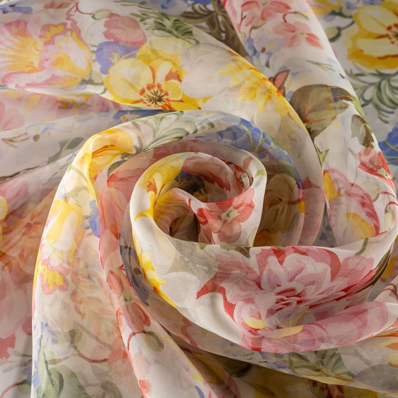 Шелковая воздушная ткань молочного оттенка с акварельным цветочным принтом. Органза достаточно формоустойчива, но пластична, она закладывается объемными фалдами и лучше всего подходит для создания и отделки пышных нарядных юбок, платьев и блуз.