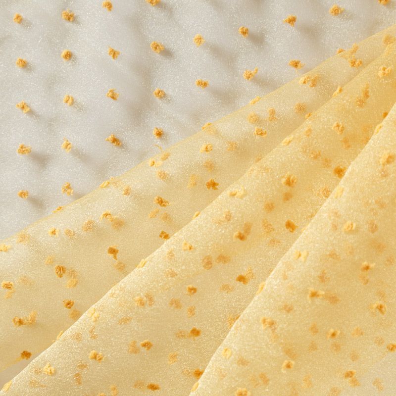 Легчайший, изящный, воздушнный и прозрачный материал с благородной переливчатой поверхностью. Прекрасно держит форму в заложеных складках. На лицевой стороне объемные декоративные элементы из флока диаметром 0.5 см. Подойдет для создания в изделии декоративных деталей, новогодних костюмов, нарядных платьев, блузок.