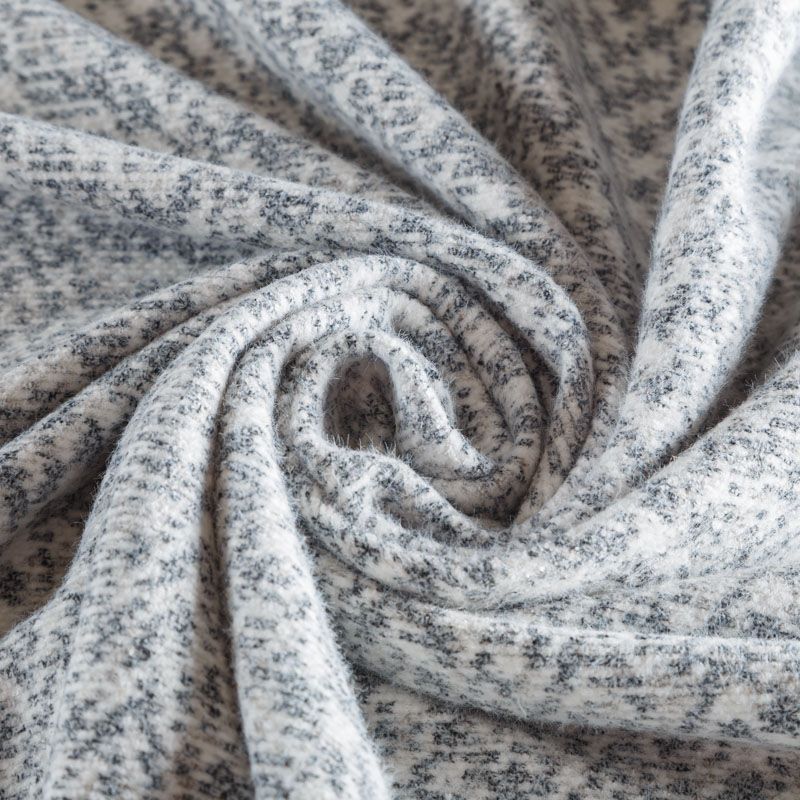 Плотный двухслойный пальтовый трикотаж белого цвета с геометрическим орнаментом серого оттенка. Ткань очень приятная на ощупь, пластичная, теплая и уютная, поверхность мягкая и шелковистая. Изнанка однотонная молочного оттенка. Прекрасно подойдет для пошива пальто, теплых жакетов, курток, кардиганов, костюмов.