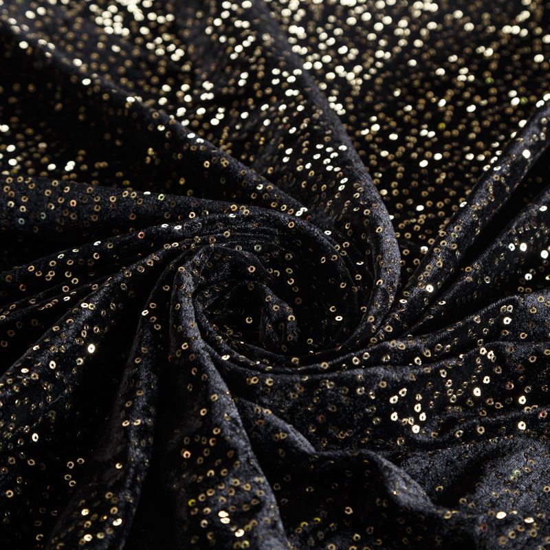 Роскошкный черный бархат с мелкими блестящими пайетками золотистого цвета. Необычное сочетание фактур и итальянское качество делают эту ткань яркой и нарядной. Она очень эластичная, мягкая и пластичная, красиво драпируется и ниспадает. Пайетки отлично подойдут для вечеринок, праздничных вечеров, корпоративов и других мероприятий в качестве платья, брюк, шорт, юбки, жакета, боди, топа, туники или комбинезона.