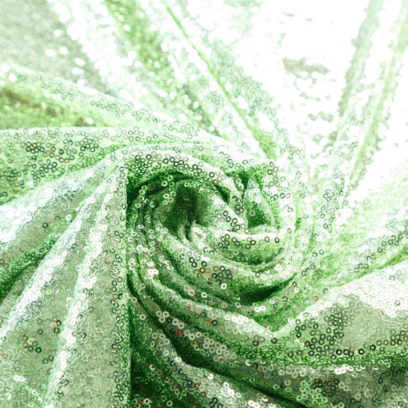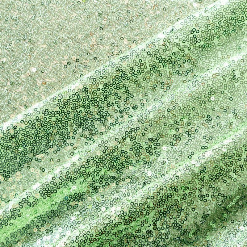Блестящие пайетки в светло-зеленом оттенке. Мелкие, размером около 3 мм, расположены в хаотичном порядке. Основа - мягкая и эластичная сетка.  Ткань полупрозрачная, может потребоваться подклад. Подойдет для вечернего, коктейльного платья, юбки, нарядных детских изделий, танцевальных и сценических костюмов.