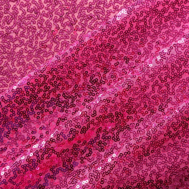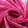 Блестящие пайетки в ярком розовом оттенке. Мелкие, размером около 3 мм, расположены в хаотичном порядке. Основа - мягкая и эластичная сетка.  Ткань полупрозрачная, может потребоваться подклад. Подойдет для вечернего, коктейльного платья, юбки, нарядных детских изделий, танцевальных и сценических костюмов.