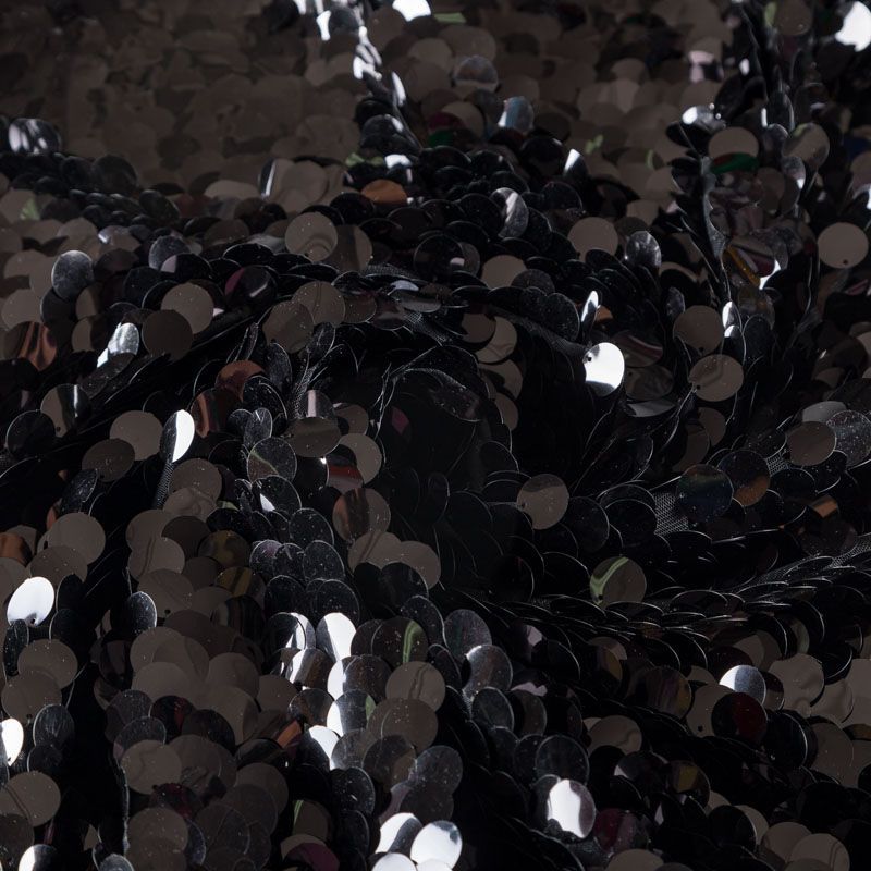 Крупные пайетки черного цвета нашиты на эластичную трикотажную сетку того же цвета как "чешуя". Пайетки матовые, круглые, в виде монеток. Настил не плотный, может требоваться подклад. Размер пайеток 1,8 см.  Ткань на ощупь мягкая и пластичная, хорошо тянется. Идеально подойдет для вечерних и праздничных образов в качестве юбки, платья, туники, топа, костюма.
