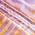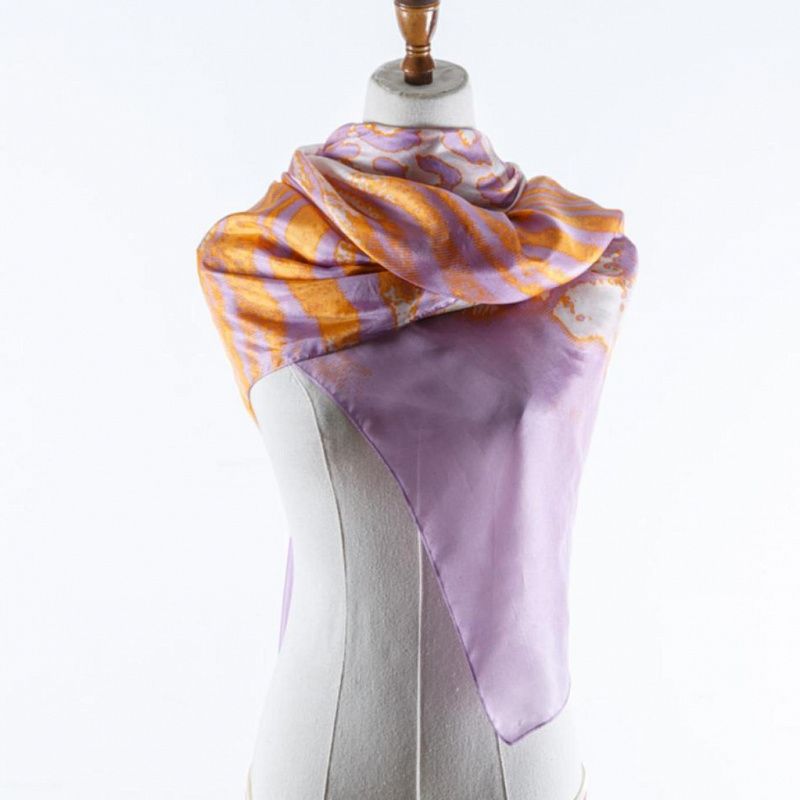 Изящный, нежный и необыкновенный шарф из итальянского шелкового шифона с крупным анималистичным принтом "зебра" в ярких оранжевых и фиолетовых тонах на молочном фоне. Невесомый, воздушный, мягкий и пластичный, летящий, поверхность с красивым матовым блеском. Будет отличным стильным аксессуаром к платью, костюму, пальто, жакету.