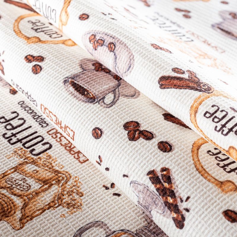 Качественная натуральная хлопчатобумажная ткань, обладающая высокой гигроскопичностью, с акварельным принтом на кофейную тему. Универсальный материал, из которого  шьют кухонные полотенца, скатерти, прихватки, салфетки.