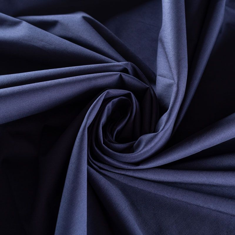 Однотонный плательно-рубашечный хлопковый поплин темно-синего оттенка. Ткань лёгкая, слегка прозрачная, поверхность матовая, гладкая, приятная к телу, хорошо драпируется, тянется за счет эластана в составе. Прекрасно подойдет блузы, платья-рубашки, летнего сарафана, туники.