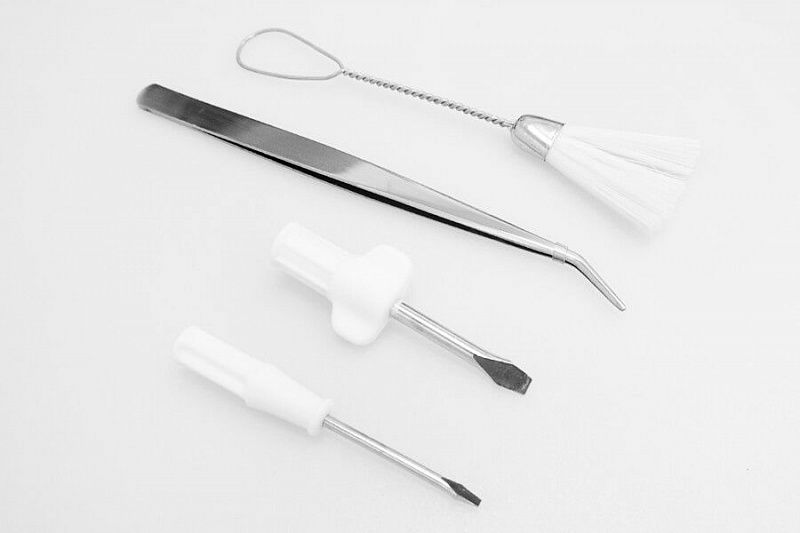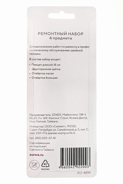 Для выполнения работ по ремонту и профилактическому обслуживанию швейной техники. В состав набора входят: пинцет длиной 18 см; двухсторонняя щетка; отвертка длиной 14 см и диаметром 2,8 мм; отвертка длиной 14 см и диаметром 4,5 мм.