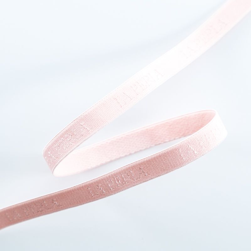 Бретелечная резинка используется для обработки стана бюстгальтера, а также для бретелей. Матовая с жаккардовой надписью бренда. Края ровные.