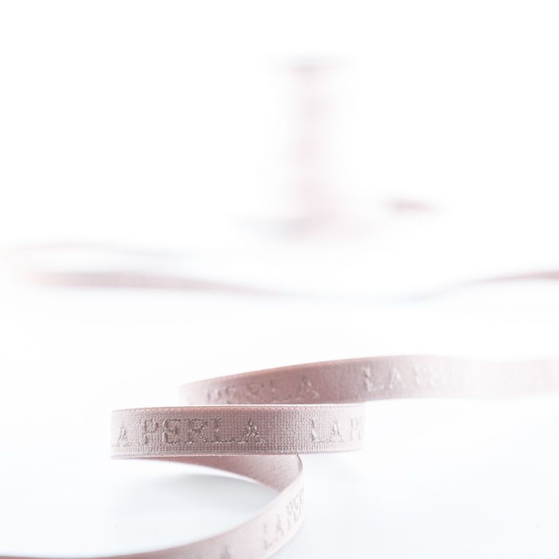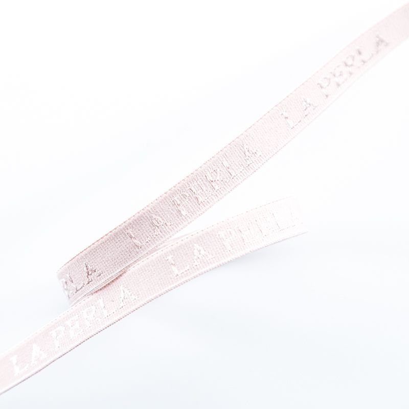Бретелечная резинка используется для обработки стана бюстгальтера, а также для бретелей. Матовая с жаккардовой надписью бренда. Края ровные.