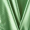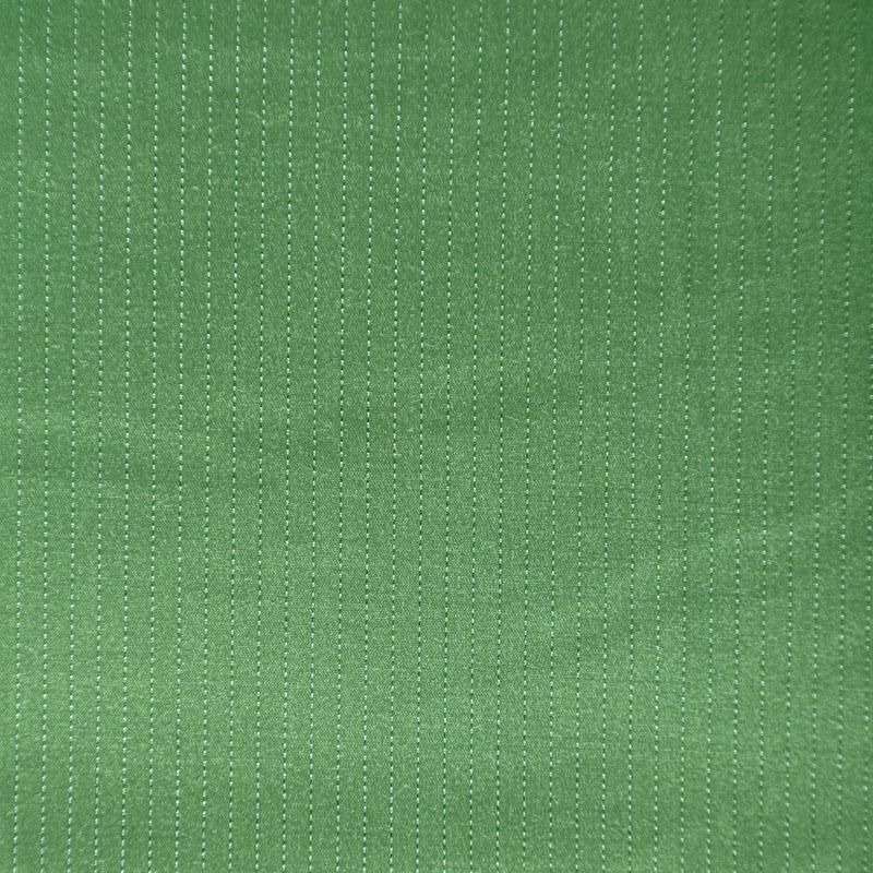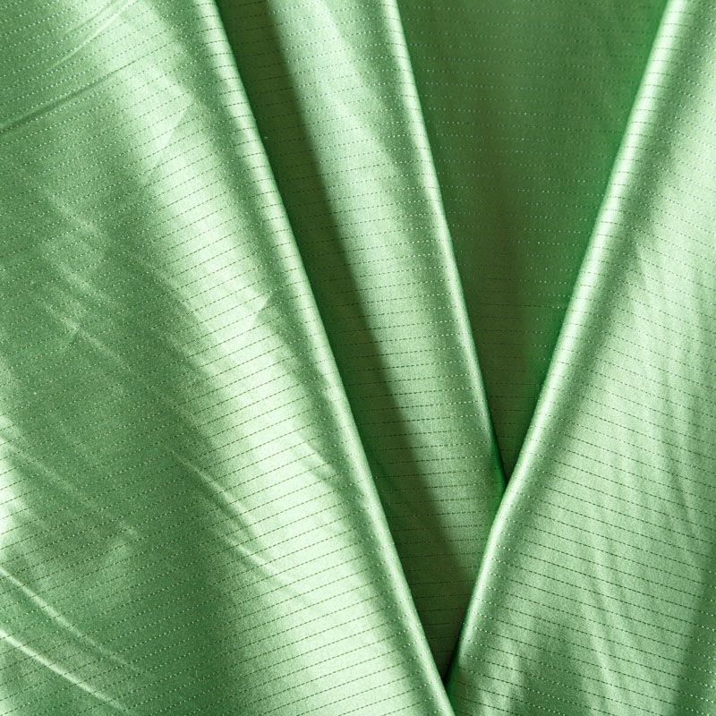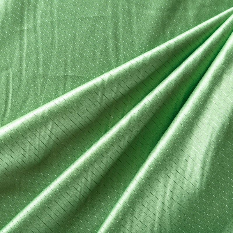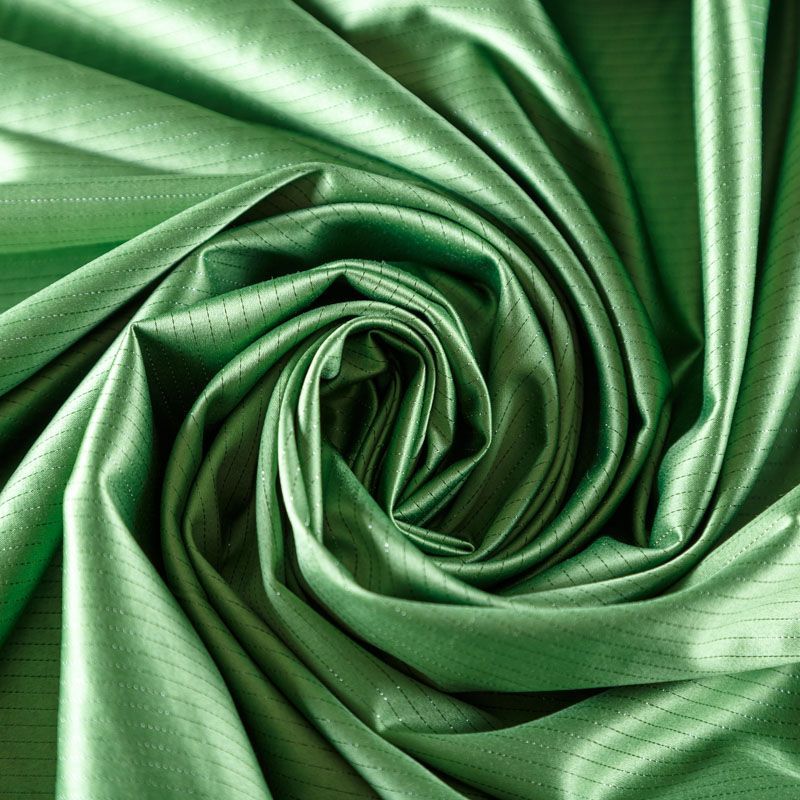 Сатин-коттон в зеленом оттенке с тонкими полосками люрексовой нити. Поверхность гладкая со сдержанным блеском, ткань средней плотности,  не толстая, хорошо держит форму, тянется за счет эластана в составе. Подойдет для пошива костюма, жакета, юбки, платья, брюк или шорт.