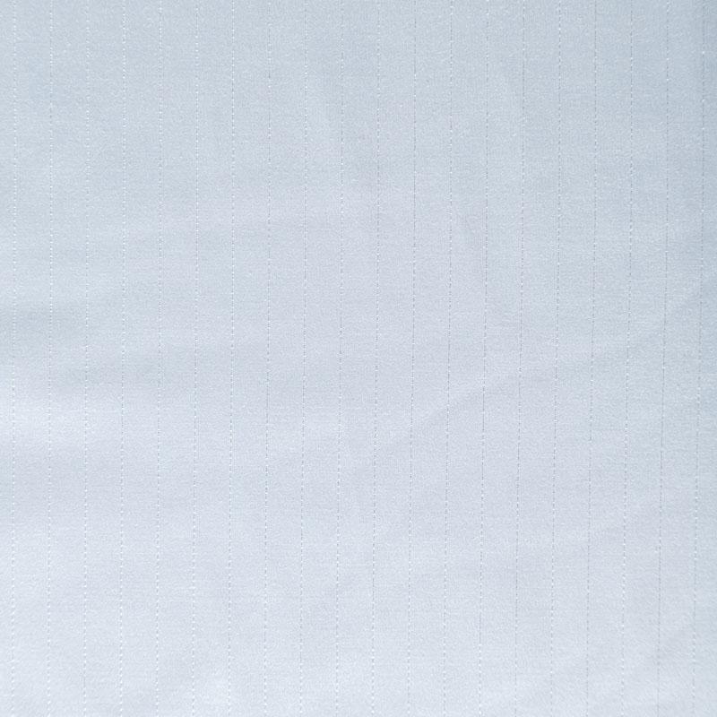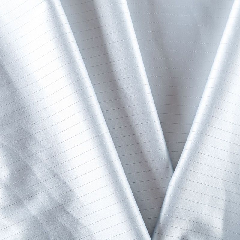 Сатин-коттон в белом оттенке с тонкими полосками люрексовой нити. Поверхность гладкая со сдержанным блеском, ткань средней плотности,  не толстая, хорошо держит форму, тянется за счет эластана в составе. Подойдет для пошива костюма, жакета, юбки, платья, брюк или шорт.