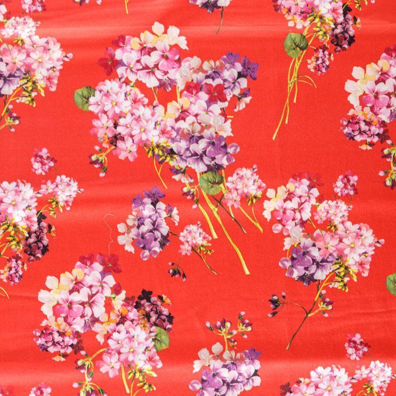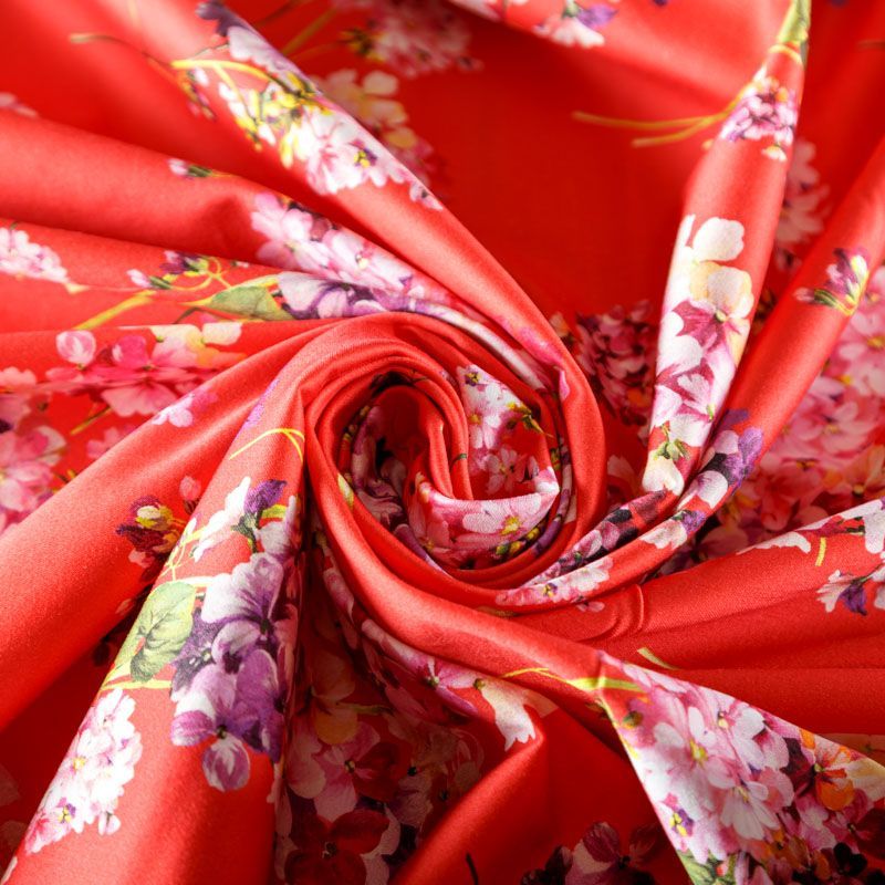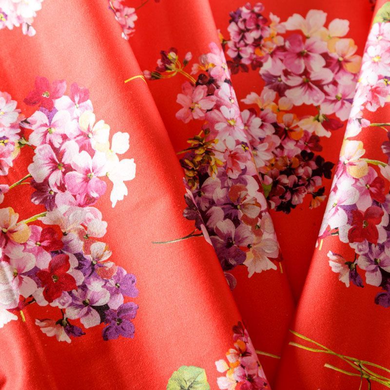 Итальянский сатин-коттон в красном оттенке с цветочным принтом. Поверхность гладкая со сдержанным блеском, ткань средней плотности,  не толстая, хорошо держит форму, тянется за счет эластана в составе. Подойдет для пошива костюма, жакета, юбки, платья, брюк или шорт.