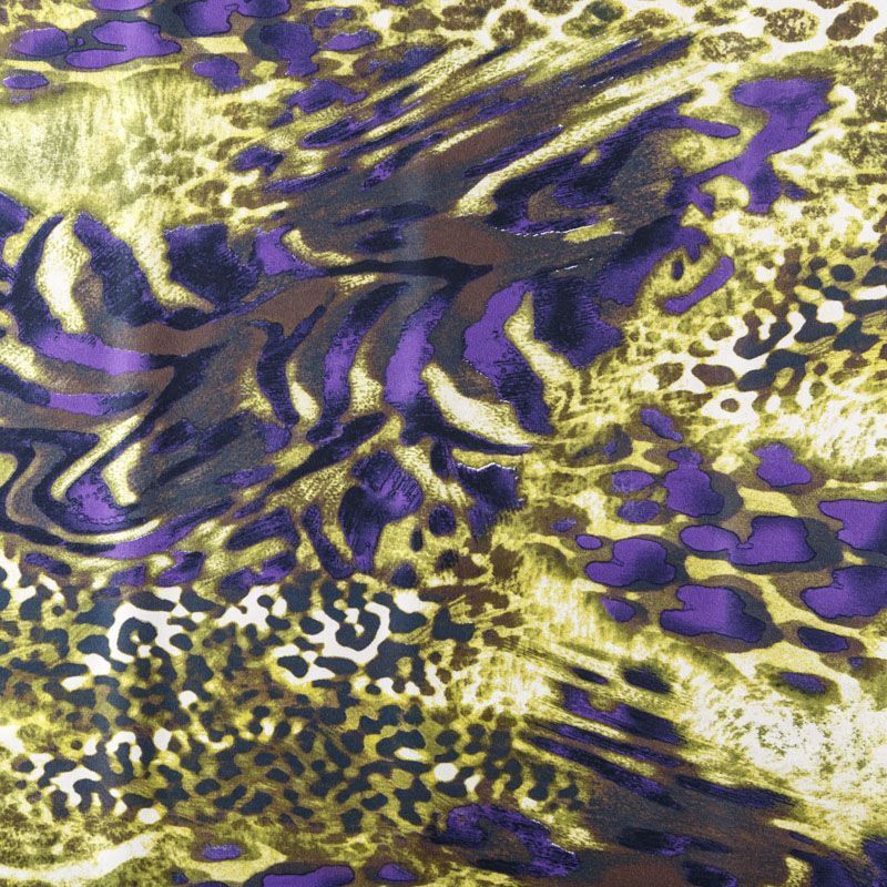 Итальянский сатин-коттон оливкового оттенка с контрастным анималистическим принтом. Поверхность гладкая со сдержанным блеском, ткань средней плотности, не толстая, хорошо держит форму, тянется за счет эластана в составе. Подойдет для пошива костюма, жакета, юбки, платья, брюк или шорт.