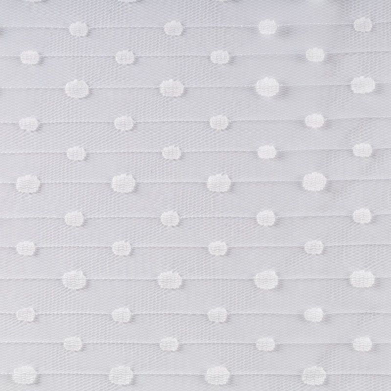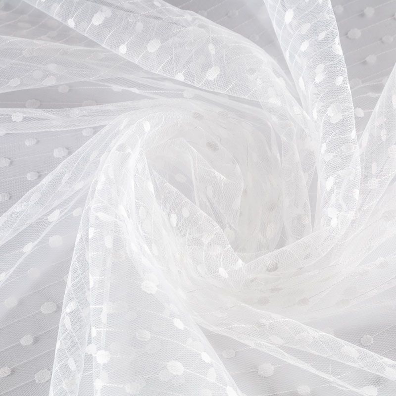 Тонкое, нежное, мягкое и прозрачное полотно, состоящее из мелких ячеек, на которых нанесен рельефный плетеный принт в виде тонких полосок с горошинами. Красиво драпируется, тянется, применяется для декорирования деталей одежды, например, рукавов изделия, для пошива нарядной и повседневной одежды: топов, блузок, пышных юбок и платьев.