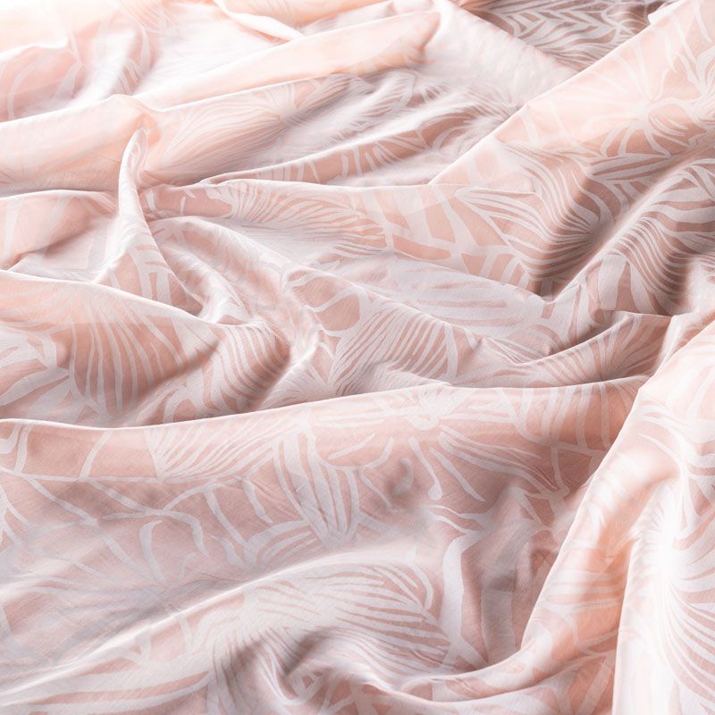 Итальянский батист пудрового оттенка с добавлением шелка с оригинально выполненным принтом с эффектом "деворе". Ткань очень легкая, прозрачная, приятная на ощупь, нежная, пластичная, хорошо и мягко драпируется, летящая. Шелк-батист подойдёт для модных блуз с объёмными рукавами, летних платьев и сарафанов с длинной летящей юбкой, прозрачных рубашек, декорированных объёмными бантами, туник и топов.