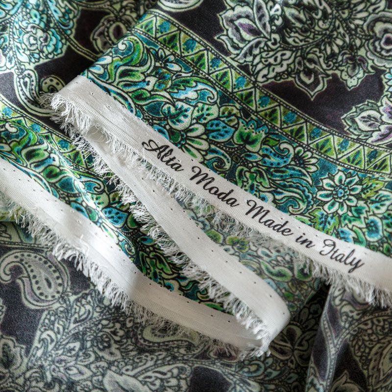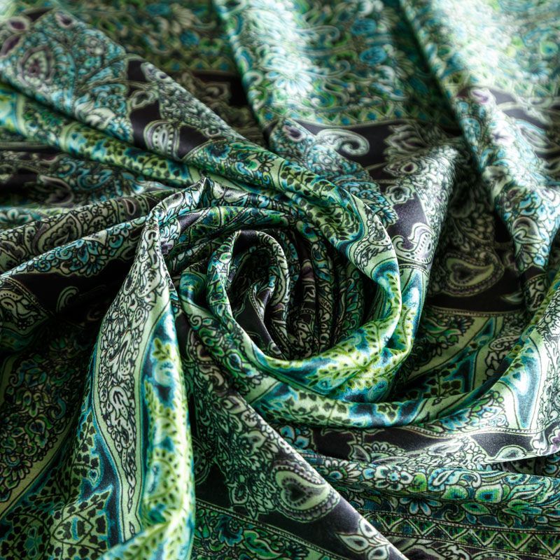 Итальянский атласный шелк с богатым орнаментом в зеленых оттенках. Ткань тонкая, не просвечивает, отлично драпируется, легкая и струящаяся, тянется за счет эластана в составе. Идеально подойдет для пошива платьев и сарафанов расклешенных моделей, с воланами, летящих юбок, топов, блузки, костюма в пижамном стиле.