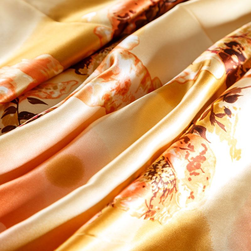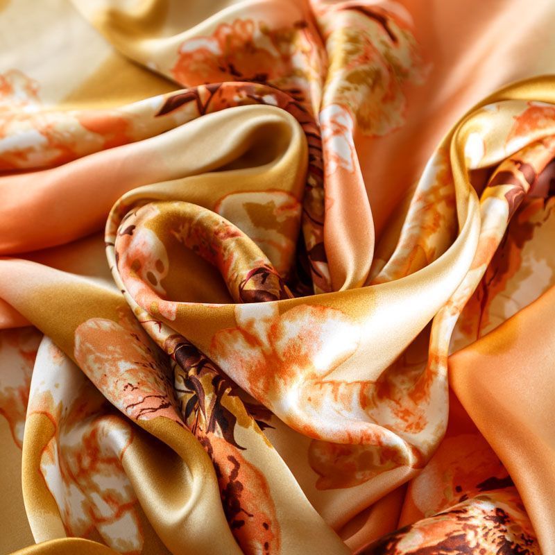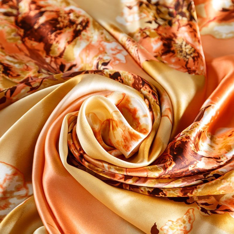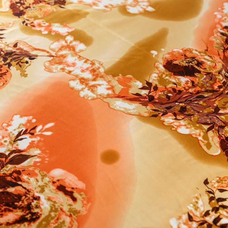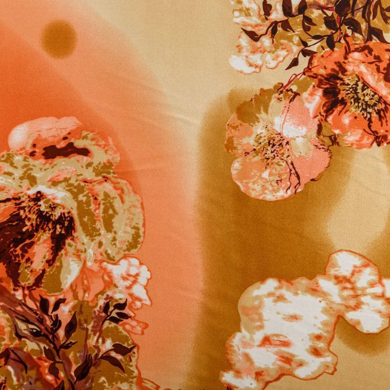 Итальянский атласный шелк с растительным принтом на карамельном фоне. Ткань тонкая, не просвечивает, отлично драпируется, легкая и струящаяся. Идеально подойдет для пошива платьев и сарафанов расклешенных моделей, с воланами, летящих юбок, топов, блузки, костюма в пижамном стиле.
