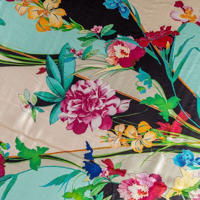 Итальянский атласный шелк с красивым ярким цветочным принтом. Ткань средней плотности, не просвечивает, струится, хорошо драпируется. Поверхность глядкая, имеет благородный сатиновый блеск. Подойдет смелых образов: летних платьев и сарафанов, как летящих фасонов, так и скроенных по косой, накидок, юбок, блузок, костюмов, широких брюк, домашней одежды.