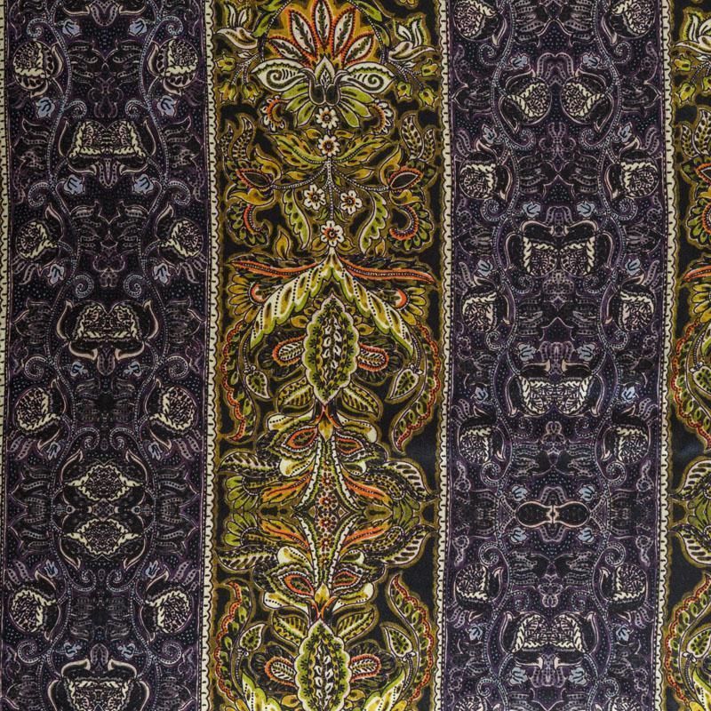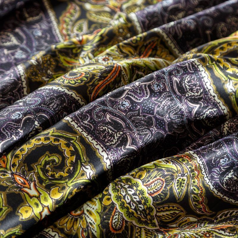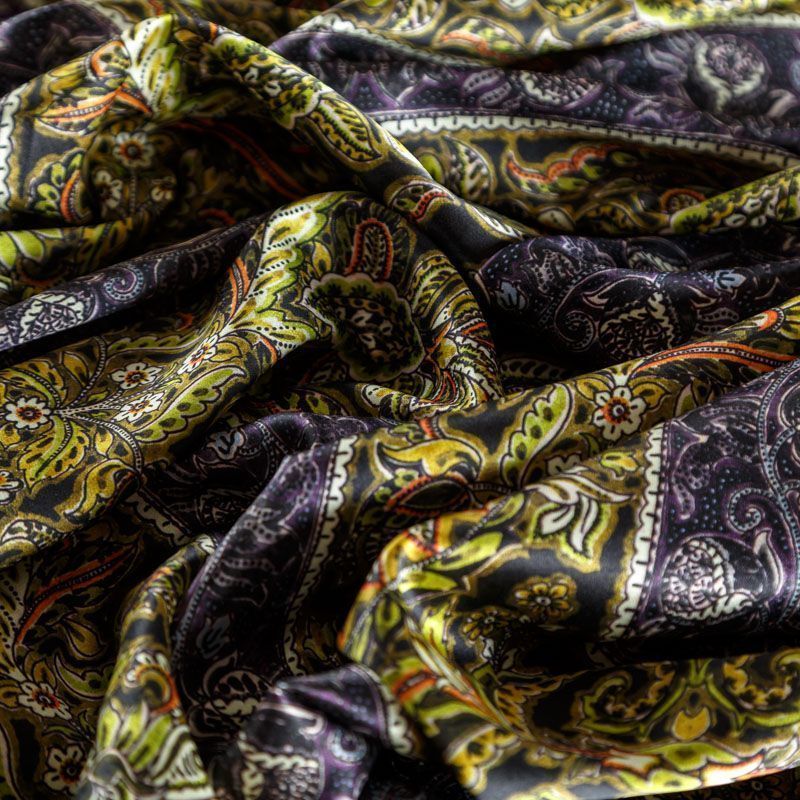 Итальянский атласный шелк с в серо-оливковых оттенках с насыщенным узором. Ткань тонкая, не просвечивает, отлично драпируется, тянется за счет эластана в составе, легкая и струящаяся. Идеально подойдет для пошива платьев и сарафанов расклешенных моделей, с воланами, летящих юбок, топов, блузки, костюма в пижамном стиле.