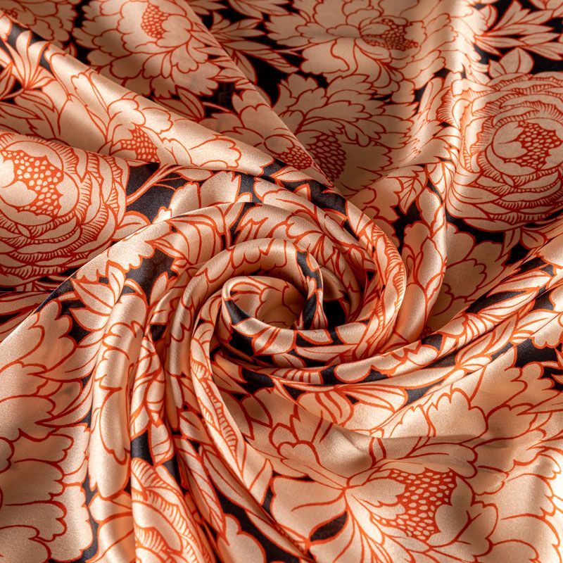 Итальянский атласный шелк с изящно прорисованными цветами в коралловых оттнках на черном фоне. Ткань тонкая, слегка просвечивает, струится, хорошо драпируется. Поверхность глядкая, имеет благородный сатиновый блеск. Подойдет смелых образов: летних платьев и сарафанов, как летящих фасонов, так и скроенных по косой, накидок, юбок, блузок, костюмов в пижамном стиле, туники, широких брюк, домашней одежды.