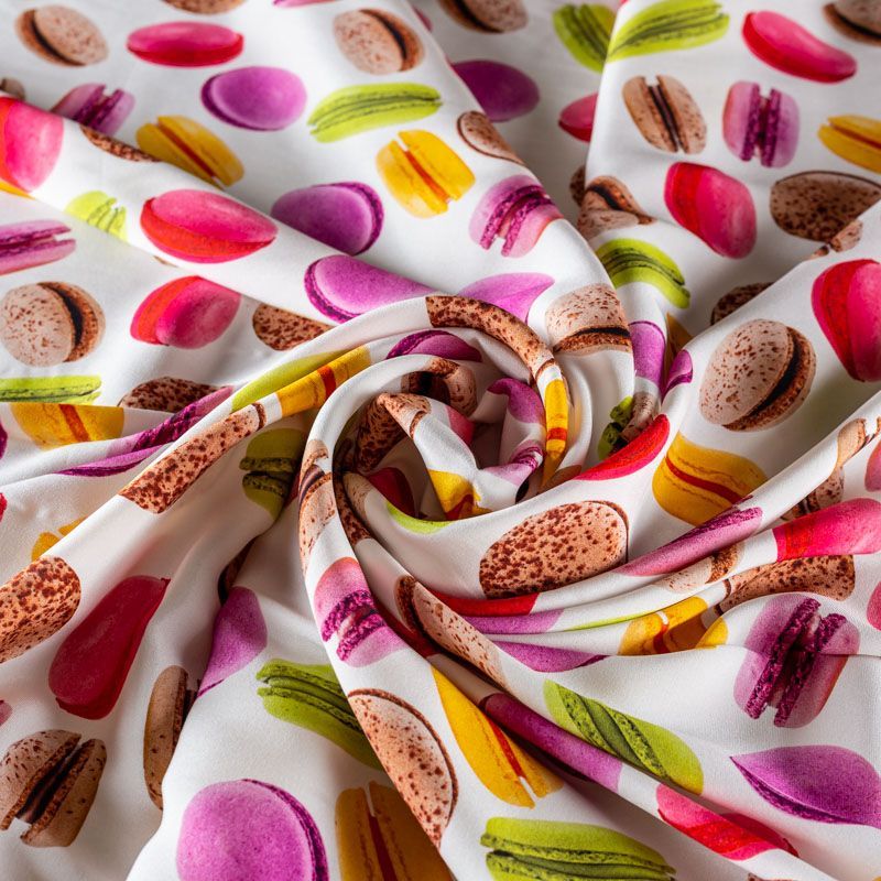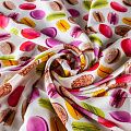 Итальянский шелк с матовой лицевой поверхностью и атласной изнанкой с "вкусным" ярким принтом на молочном фоне, тонкий, слегка прозрачный, отлично драпируется, не много тянется за счет эластана в составе, легкий и струящийся. Идеально подойдет для пошива платьев и сарафанов расклешенных моделей, с воланами, летящих юбок, топов, блузки, костюма в пижамном стиле.