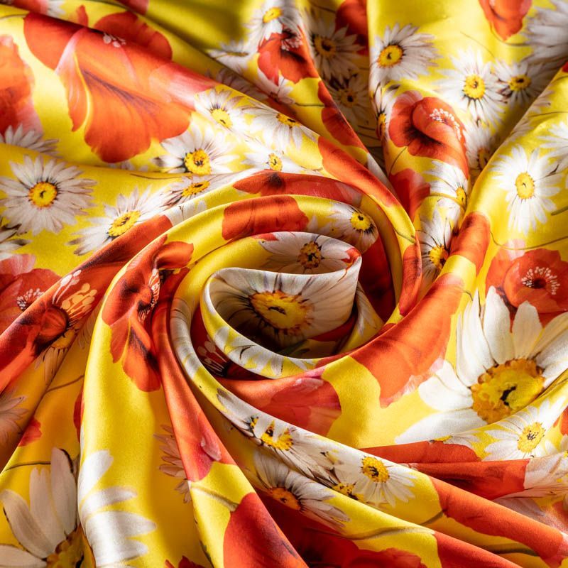 Итальянский атласный шелк, дизайн которого вдохновлен образом из коллекции известного бренда. На солнечном теплом фоне здесь - лаконичный и очень летний рисунок в виде ромашек и красных маков. Ткань средней плотности, не просвечивает, струится, хорошо драпируется. Поверхность глядкая, имеет благородный сатиновый блеск. Подойдет для летних платьев, накидок, юбок, блузок, костюмов, широких брюк, домашней одежды.