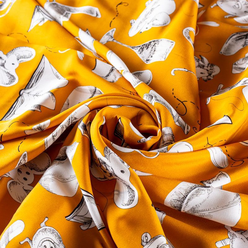 Итальянский матовый шелк благородного шафранового оттенка с узнаваемым игривым принтом от известного бренда. Ткань тонкая, не просвечивается, отлично драпируется, легкая и струящаяся, тянется за счет эластана в составе, лицевая сторона креповая, изнанка - атласная. Идеально подойдет для пошива платьев и сарафанов расклешенных моделей, с воланами, рюшами, летящих юбок, топов, блузки, рубашки, костюма в пижамном стиле.