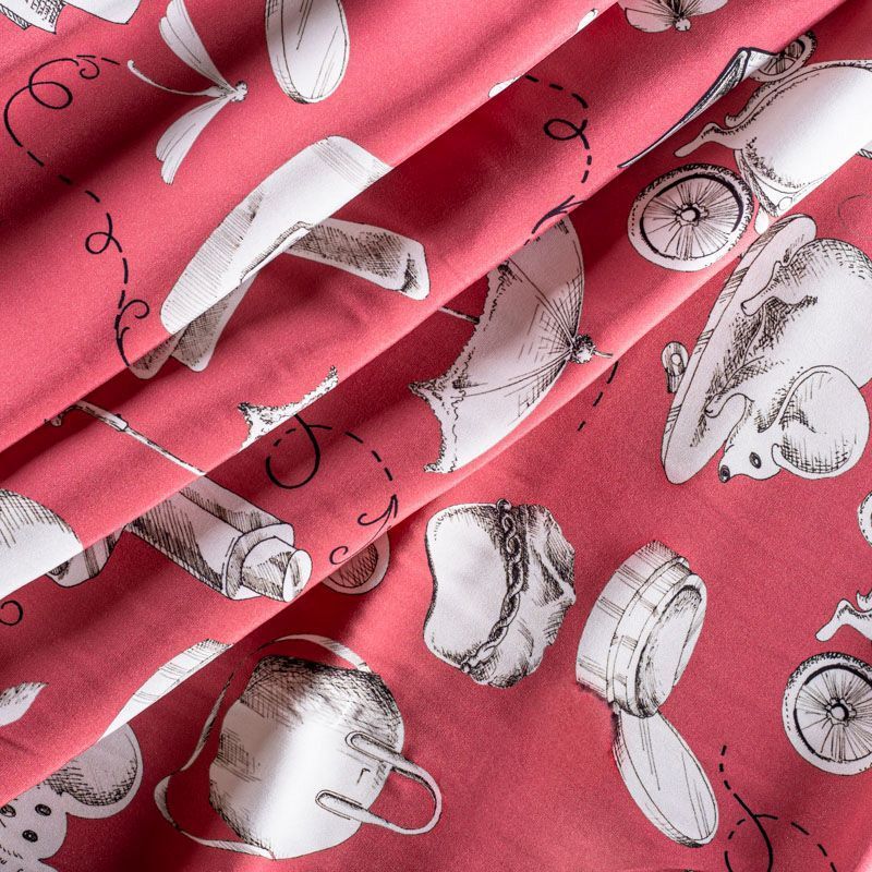 Итальянский матовый шелк кораллового оттенка с узнаваемым игривым принтом от известного бренда. Ткань тонкая, не просвечивается, отлично драпируется, легкая и струящаяся, тянется за счет эластана в составе, лицевая сторона креповая, изнанка - атласная. Идеально подойдет для пошива платьев и сарафанов расклешенных моделей, с воланами, рюшами, летящих юбок, топов, блузки, рубашки, костюма в пижамном стиле.