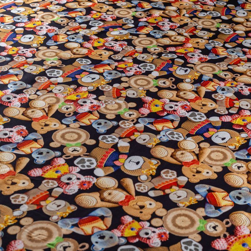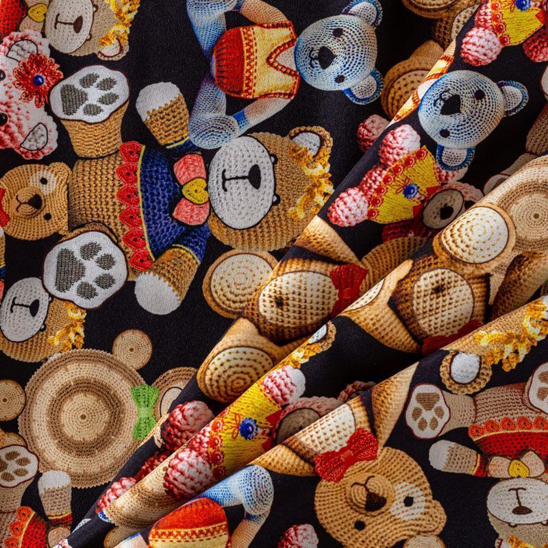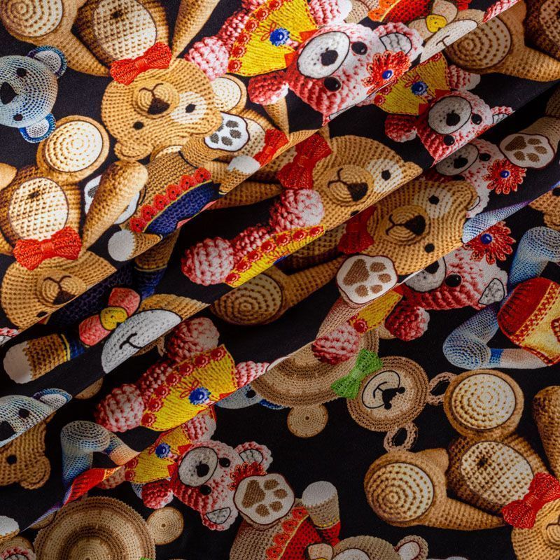тальянский матовый шелк черного цвета с узнаваемым игривым принтом от известного бренда. Ткань тонкая, не просвечивается, отлично драпируется, легкая и струящаяся, тянется за счет эластана в составе, лицевая сторона креповая, изнанка - атласная. Идеально подойдет для пошива платьев и сарафанов расклешенных моделей, с воланами, рюшами, летящих юбок, топов, блузки, рубашки, костюма в пижамном стиле.