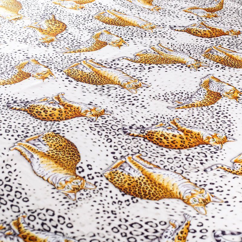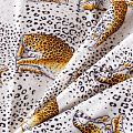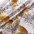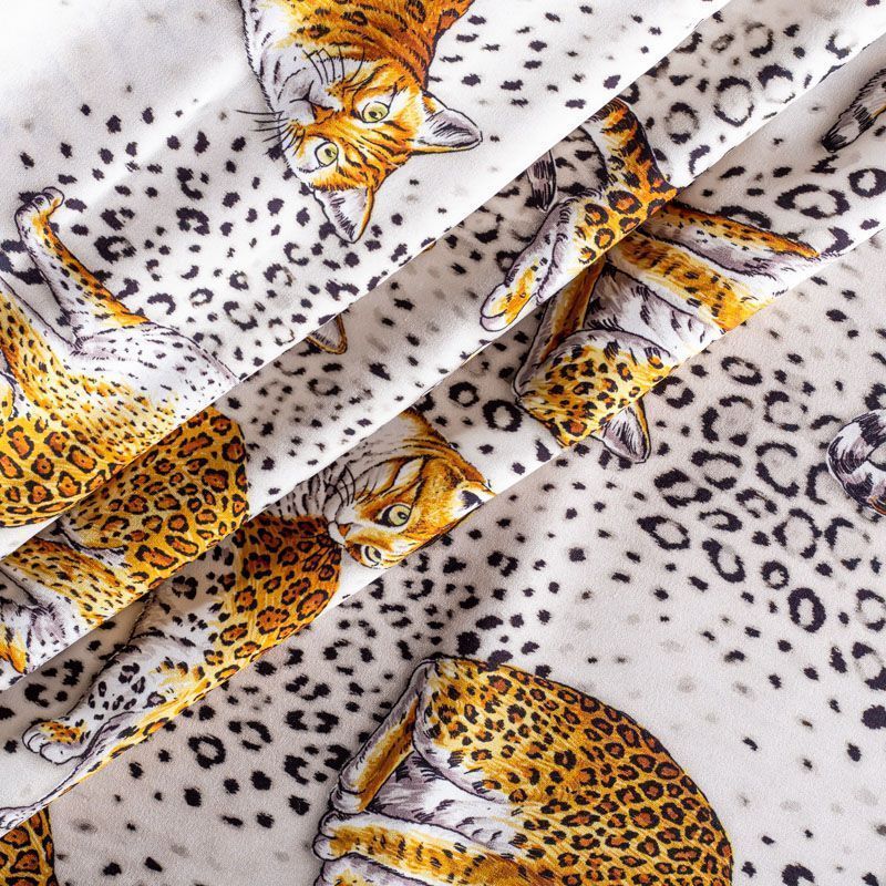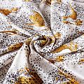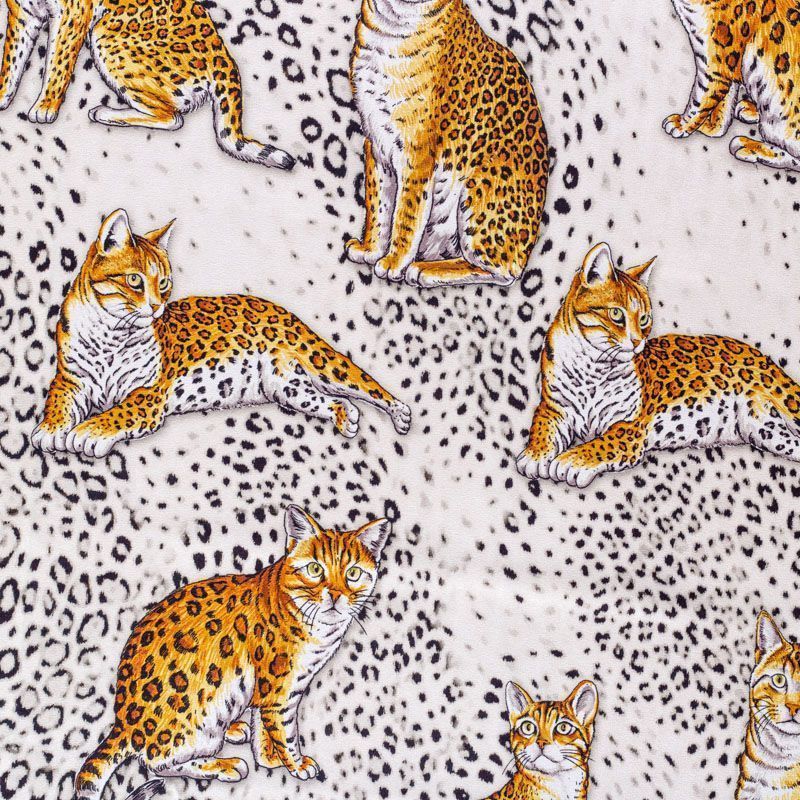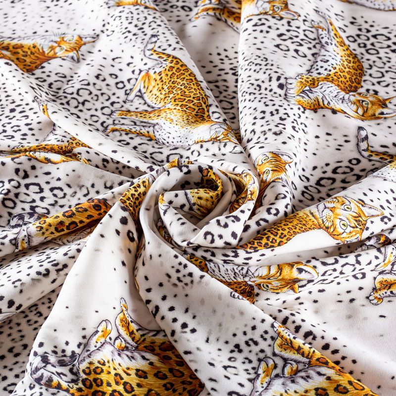 Итальянский матовый шелк молочного оттенка с узнаваемым принтом диких кошек от известного бренда. Ткань тонкая, не просвечивается, отлично драпируется, легкая и струящаяся, тянется за счет эластана в составе, лицевая сторона креповая, изнанка - атласная. Идеально подойдет для пошива платьев и сарафанов расклешенных моделей, с воланами, рюшами, летящих юбок, топов, блузки, рубашки, костюма в пижамном стиле.