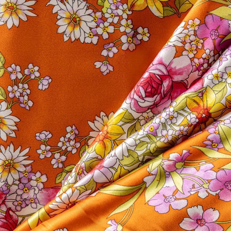 Итальянский шелк с цветочным принтом на ярком оранжевом фоне, тонкий, не просвечивает, отлично драпируется, легкий и струящийся с атласной поверхностью. Идеально подойдет для пошива платьев и сарафанов расклешенных моделей, с воланами, летящих юбок, топов, блузы, костюма в пижамном стиле.