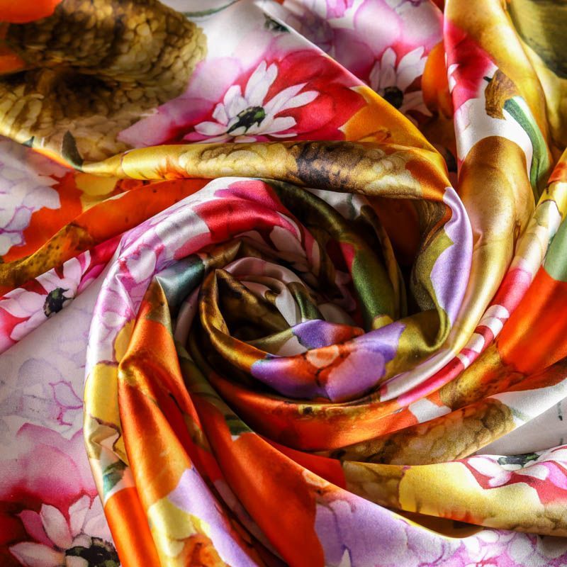 Итальянский атласный шелк с красивым акварельным цветочным принтом. Ткань средней плотности, не просвечивает, струится, хорошо драпируется. Поверхность глядкая, имеет благородный сатиновый блеск. Подойдет для летних платьев и сарафанов, как летящих фасонов, так и скроенных по косой, накидок, юбок, блузок, костюмов, широких брюк, домашней одежды.