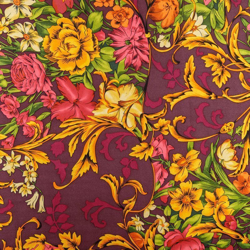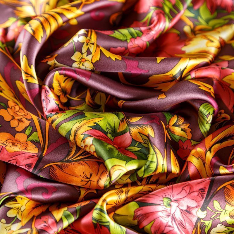 Итальянский атласный шелк с красивым принтом. Ткань средней плотности, не просвечивает, струится, хорошо драпируется. Поверхность глядкая, имеет благородный сатиновый блеск. Подойдет смелых образов: летних платьев и сарафанов, как летящих фасонов, так и скроенных по косой, накидок, юбок, блузок, костюмов, широких брюк, домашней одежды.