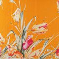 Итальянский шелк с матовой поверхностью, легкий, струящийся, хорошо драпируется. Яркий цветочный принт на оранжевом фоне дополнен по кромке полосками контрастного синего цвета. Ткань набирается объемом. Прекрасно подойдет для пошива летнего сарафана, платья, блузки, костюма в пижамном стиле, широких брюк или юбки.