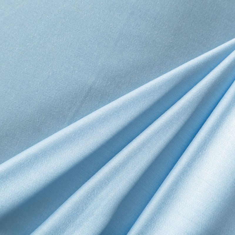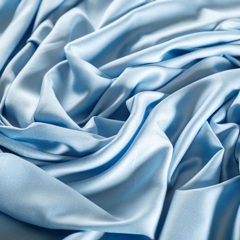 Плательно-блузочный штапель с добавлением шелка в голубом оттенке. Мягкий, нежный, пластичный, шелковистый на ощупь, хорошо драпируется, практичный, тянется за счет эластана в составе. Особенно актуален летом, он очень легкий, обволакивающий прохладой. Идеален для пошива летней детской одежды, сарафанов, платьев, юбок, блузок, домашней одежды: халатов, ночной пижамы.