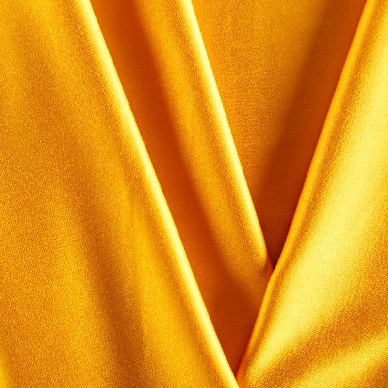 Плательно-блузочный штапель с добавлением шелка в желтом оттенке. Мягкий, нежный, пластичный, шелковистый на ощупь, хорошо драпируется, практичный, тянется за счет эластана в составе. Особенно актуален летом, он очень легкий, обволакивающий прохладой. Идеален для пошива летней детской одежды, сарафанов, платьев, юбок, блузок, домашней одежды: халатов, ночной пижамы.