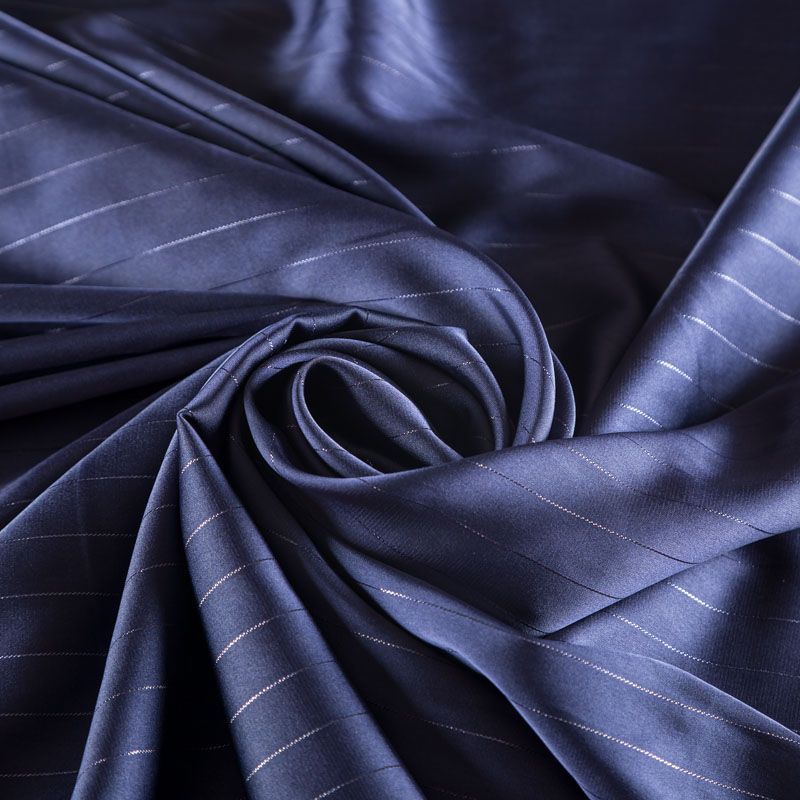Тонкая, легкая, струящаяся ткань, декорированная тонкими вертикальными полосками люресовой нити, не просвечивает, очень нежная и прятная к телу, обладает благородным атласным блеском, хорошо драпируется, тянется за счет эластана в составе. Идеально подойдет для пошива блузок, платьев и юбок, а также топов, платков, домашней одежды.