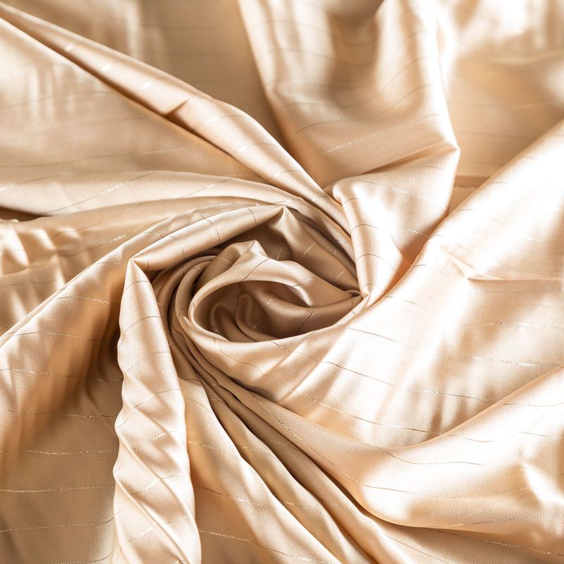 Тонкая, легкая, струящаяся ткань, декорированная тонкими вертикальными полосками люресовой нити, не просвечивает, очень нежная и прятная к телу, обладает благородным атласным блеском, хорошо драпируется, тянется за счет эластана в составе. Идеально подойдет для пошива блузок, платьев и юбок, а также топов, платков, домашней одежды.