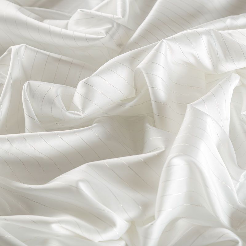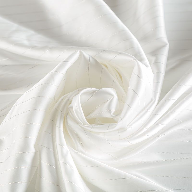 Тонкая, легкая, струящаяся ткань, декорированная тонкими вертикальными полосками люресовой нити, не просвечивает, очень нежная и прятная к телу, обладает благородным атласным блеском, хорошо драпируется, тянется за счет эластана в составе. Идеально подойдет для пошива блузок, платьев и юбок, а также топов, платков, домашней одежды.