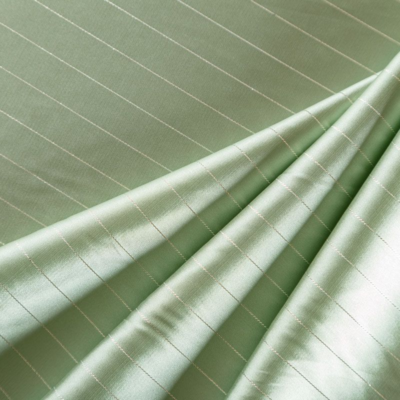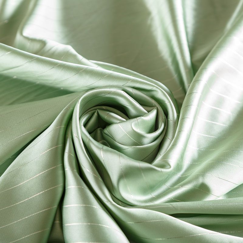 Тонкая, легкая, струящаяся ткань, декорированная тонкими вертикальными полосками люресовой нити, не просвечивает, очень нежная и прятная к телу, обладает благородным атласным блеском, хорошо драпируется, тянется за счет эластана в составе. Идеально подойдет для пошива блузок, платьев и юбок, а также топов, платков, домашней одежды.