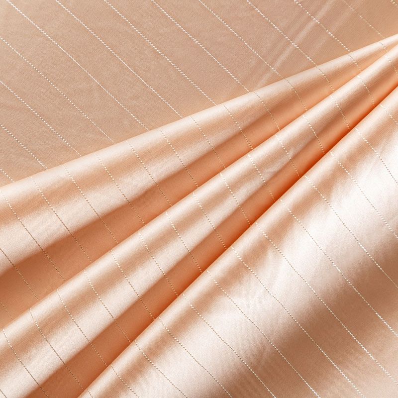 Тонкая, легкая, струящаяся ткань, декорированная тонкими вертикальными полосками люресовой нити, не просвечивает, очень нежная и прятная к телу, обладает благородным атласным блеском, хорошо драпируется, тянется за счет эластана в составе. Идеально подойдет для пошива блузок, платьев и юбок, а также топов, платков, домашней одежды.