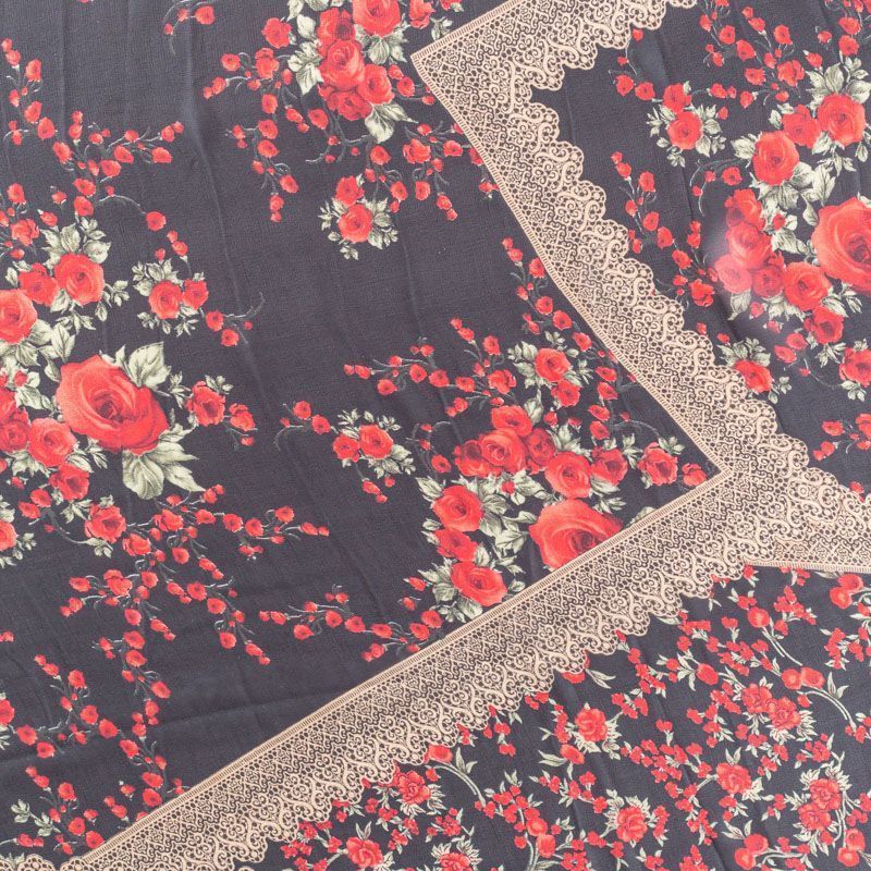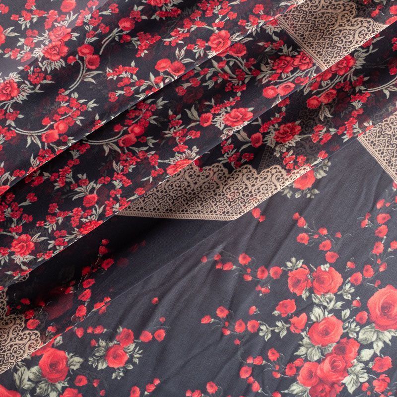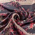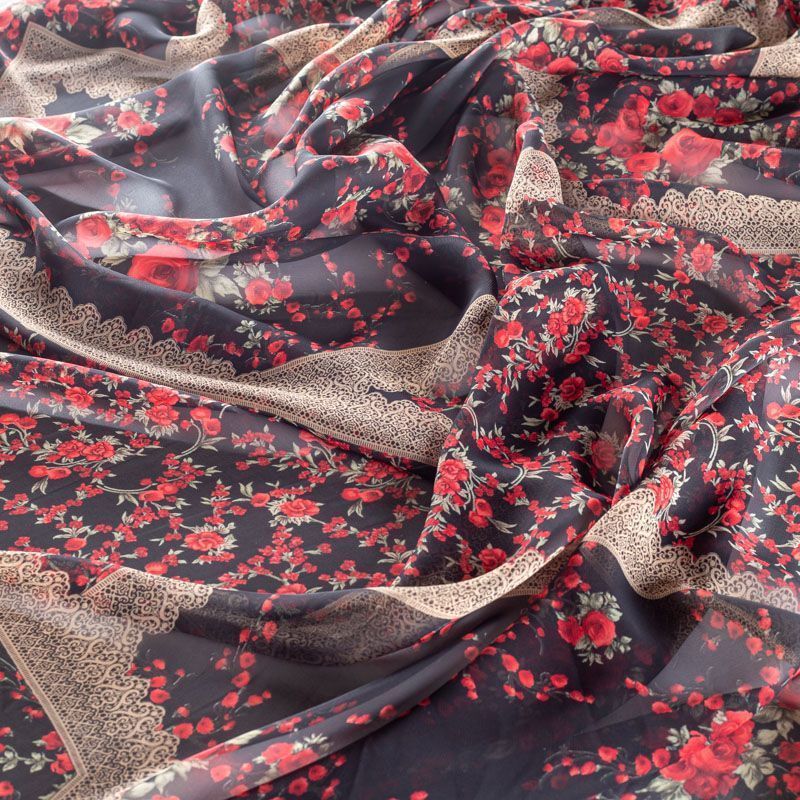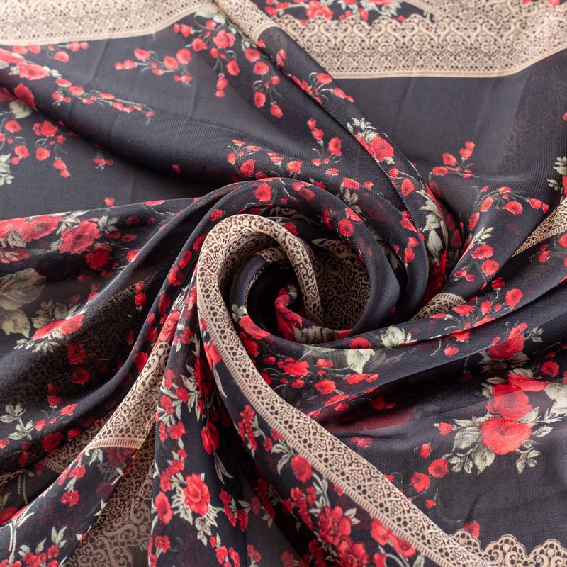 Шифон черного оттенка с цветочным принтом и имитацией кружева. Струящийся, летящий, воздушный, полупрозрачный. На ощупь мягкий и приятный.Подойдет для пошива тончайших воздушных блуз, изумительных платьев со сборками и воланами и элегантных шарфов.